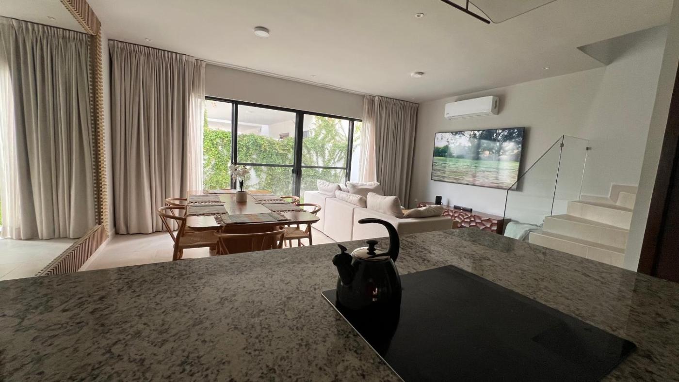 Three-Bedroom House. Guests will have a special experience as the holiday home features a private pool. The spacious holiday home features 3 bedrooms and 3 bathrooms with a shower and free toiletries. Guests can make meals in the kitchen that is equipped with a stovetop, a refrigerator, a dishwasher and an oven. The air-conditioned holiday home provides a flat-screen TV, a private entrance, a seating area, a dining area as well as garden views. The unit offers 4 beds.